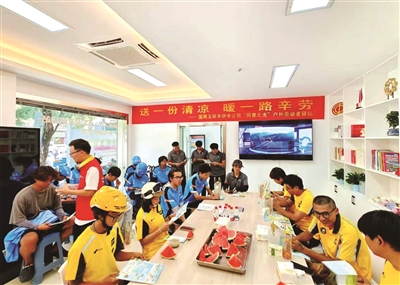 驿站位于清港供电所,电冰箱、微波炉、空调、应急药箱等一应俱全,可满足歇脚、热饭、充电等需求。启用当天,“送一份清凉·暖一路辛劳”主题活动同步开展,近30名外卖骑手、环卫工人等收到花露水、藿香正气水等防暑物品,还品尝到绿豆汤、西瓜。国网浙江电力(玉环)红船党员服务队还科普夏季防暑与安全用电知识,提升户外劳动者防护能力。