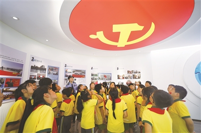 在国庆、中秋双节来临之际,台州出入境边防检查站迎来了一群“小客人”,台州市黄岩区头陀小学45名学生在该站民警的带领下,“近距离”体验警营生活、“零距离”感受警营文化,在寓教于乐中度过了一次意义非凡的爱国之旅。图为民警带领学生参观边检站警史馆。 通讯员李斌斌 摄