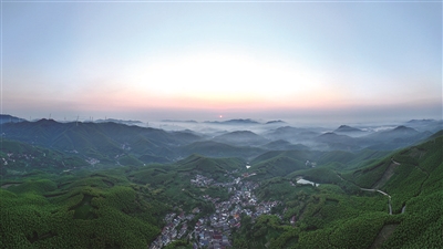 昨日,湖州市吴兴区埭溪镇大冲村,错落有致的民居与青山、晨雾、竹海等相映成趣,构成一幅美丽的生态画卷。