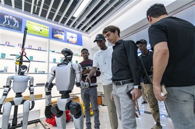 图为在义乌全球数贸中心市场里,国内外客商在体验机器人互动。